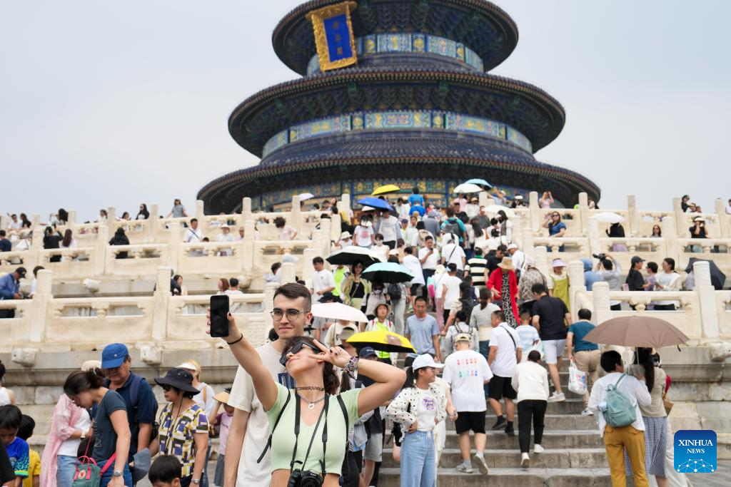 BEIJING, 16 julio, 2024 (Xinhua) -- Imagen del 9 de julio de 2024 de turistas extranjeros posando para una fotografía frente al Salón de Oración por las Buenas Cosechas, o Qiniandian, en el parque Tiantan (Templo del Cielo), en Beijing, capital de China. (Xinhua/Ju Huanzong)