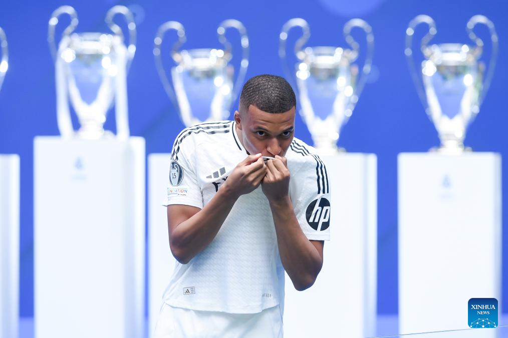 MADRID, 17 julio, 2024 (Xinhua) -- Imagen del 16 de julio de 2024 de Kylian Mbappé besando su playera durante su presentación oficial como jugador del Real Madrid en el Estadio Santiago Bernabeu, en Madrid, España. (Xinhua/Gustavo Valiente)