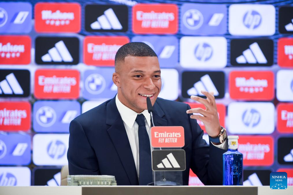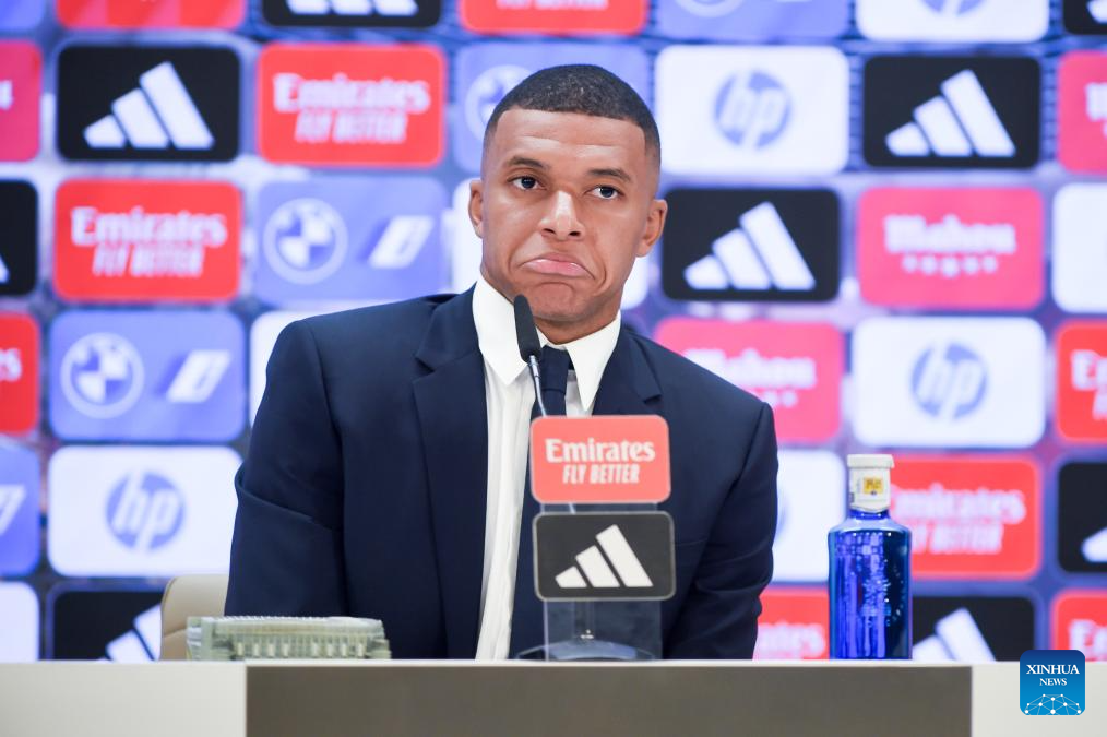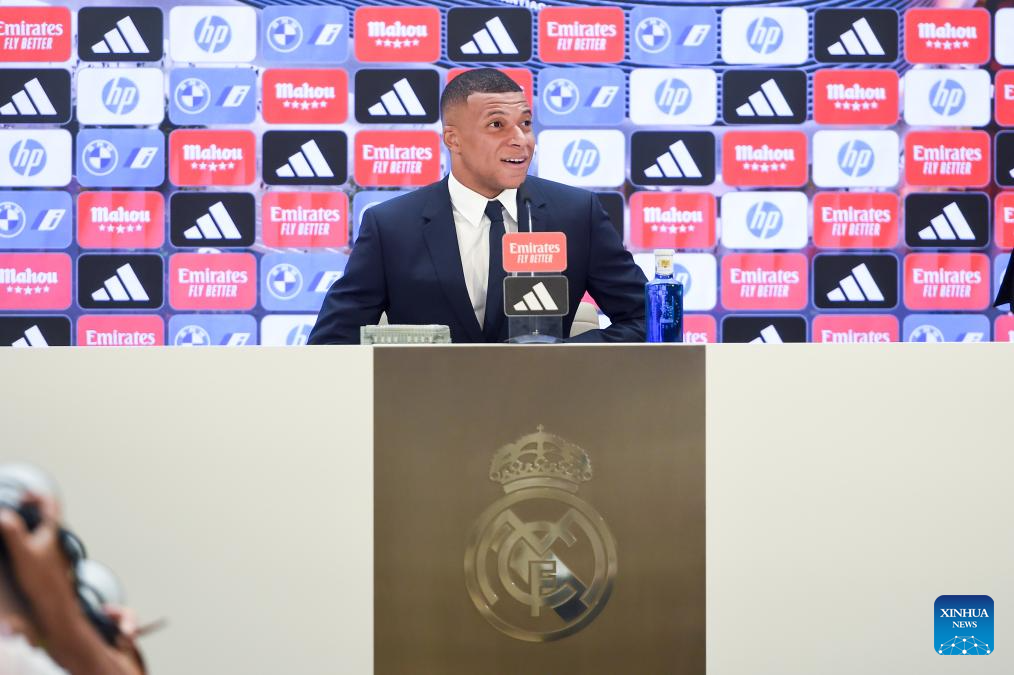 MADRID, 17 julio, 2024 (Xinhua) -- Imagen del 16 de julio de 2024 de Kylian Mbappé, de Francia, hablando durante la conferencia de prensa después de su presentación oficial como jugador del Real Madrid en el Estadio Santiago Bernabeu, en Madrid, España. (Xinhua/Gustavo Valiente)