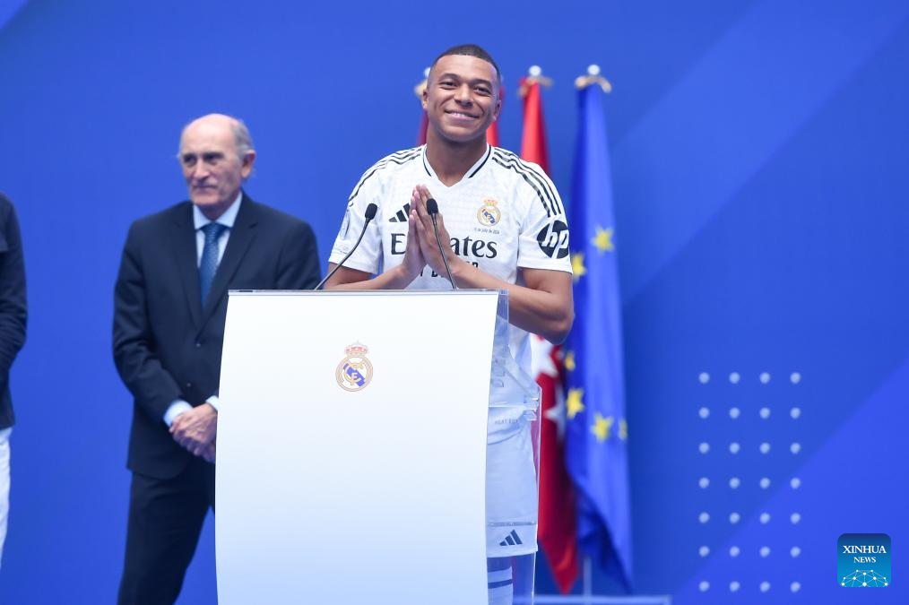 MADRID, 17 julio, 2024 (Xinhua) -- Imagen del 16 de julio de 2024 de Kylian Mbappé reaccionando durante su presentación oficial como jugador del Real Madrid en el Estadio Santiago Bernabeu, en Madrid, España. (Xinhua/Gustavo Valiente)