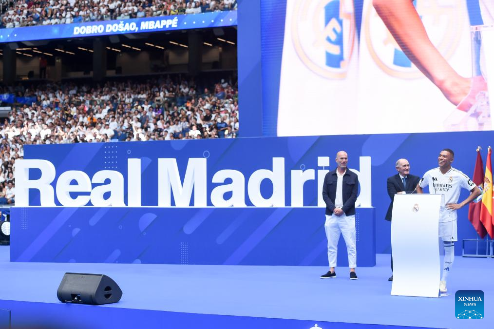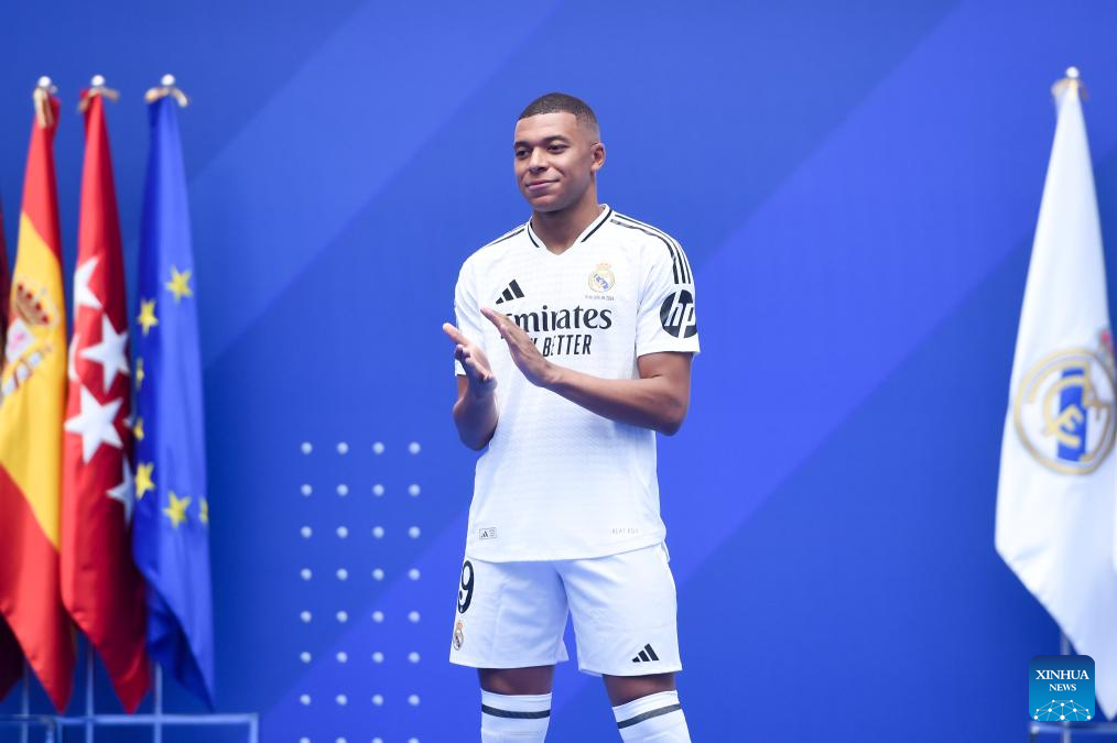 MADRID, 17 julio, 2024 (Xinhua) -- Imagen del 16 de julio de 2024 de Kylian Mbappé aplaudiendo durante su presentación oficial como jugador del Real Madrid en el Estadio Santiago Bernabeu, en Madrid, España. (Xinhua/Gustavo Valiente)