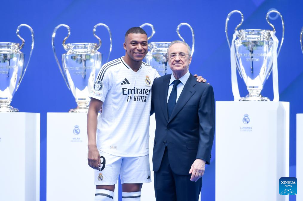 MADRID, 17 julio, 2024 (Xinhua) -- Imagen del 16 de julio de 2024 del presidente del Real Madrid, Florentino Pérez (d), posando con Kylian Mbappé durante la presentación oficial de Mbappé como jugador del Real Madrid en el Estadio Santiago Bernabeu, en Madrid, España. (Xinhua/Gustavo Valiente)