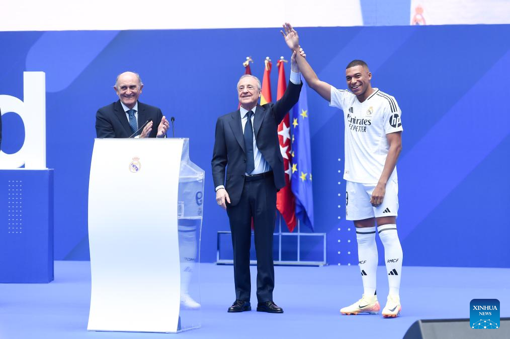 MADRID, 17 julio, 2024 (Xinhua) -- Imagen del 16 de julio de 2024 del presidente del Real Madrid, Florentino Pérez (c), levantando la mano de Kylian Mbappé durante la presentación oficial de Mbappé como jugador del Real Madrid en el Estadio Santiago Bernabeu, en Madrid, España. (Xinhua/Gustavo Valiente)