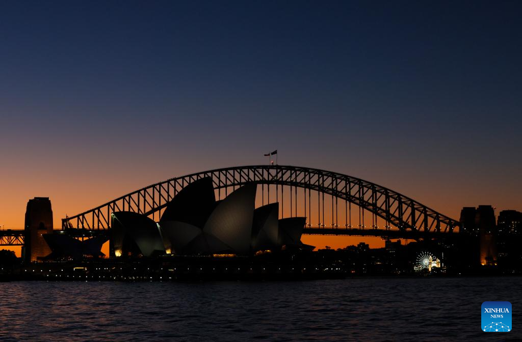 SIDNEY, 23 julio, 2024 (Xinhua) -- Imagen del 23 de julio de 2024 de una vista del atardecer de la Casa de la Opera y el Puente del Puerto, en Sídney, Australia. (Xinhua/Ma Ping)