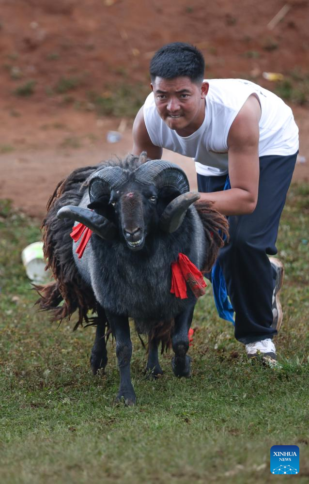 BUTUO, 23 julio, 2024 (Xinhua) -- Imagen del 21 de julio de 2024 de un hombre preparándose para la lucha de ovejas durante un festival de antorchas, en el municipio de Eliping, en el distrito de Butuo, en la provincia de Sichuan, en el suroeste de China. Del 21 al 23 de julio, un festival tradicional de antorchas del grupo étnico yi se llevó a cabo en el distrito de Butuo. Personas participaron en varios eventos deportivos folclóricos como carreras de caballos, lucha de ovejas, corridas de toros y lucha durante el festival. (Xinhua/Jiang Hongjing)