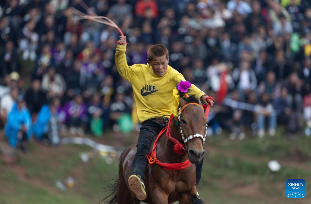 BUTUO, 23 julio, 2024 (Xinhua) -- Imagen del 21 de julio de 2024 de un niño participando en una carrera de caballos durante un festival de antorchas, en el municipio de Eliping, en el distrito de Butuo, en la provincia de Sichuan, en el suroeste de China. Del 21 al 23 de julio, un festival tradicional de antorchas del grupo étnico yi se llevó a cabo en el distrito de Butuo. Personas participaron en varios eventos deportivos folclóricos como carreras de caballos, lucha de ovejas, corridas de toros y lucha durante el festival. (Xinhua/Jiang Hongjing)