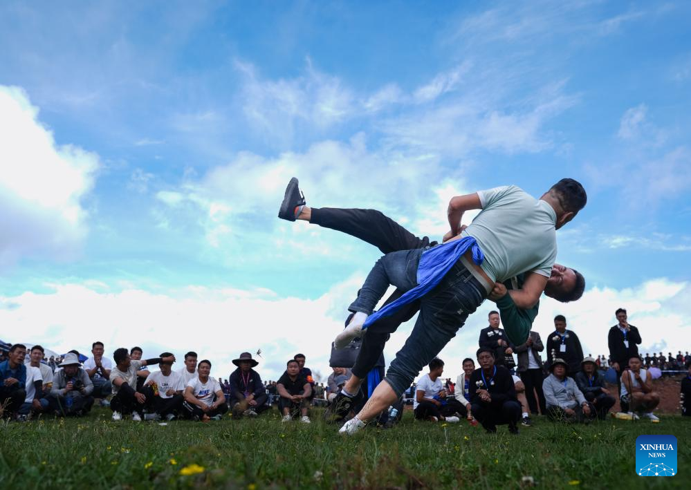 BUTUO, 23 julio, 2024 (Xinhua) -- Imagen del 21 de julio de 2024 de personas luchando durante un festival de antorchas, en el municipio de Eliping, en el distrito de Butuo, en la provincia de Sichuan, en el suroeste de China. Del 21 al 23 de julio, un festival tradicional de antorchas del grupo étnico yi se llevó a cabo en el distrito de Butuo. Personas participaron en varios eventos deportivos folclóricos como carreras de caballos, lucha de ovejas, corridas de toros y lucha durante el festival. (Xinhua/Jiang Hongjing)