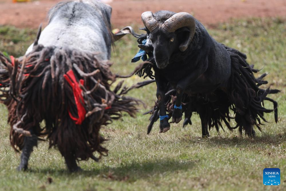 BUTUO, 23 julio, 2024 (Xinhua) -- Imagen del 21 de julio de 2024 de ovejas luchando durante un festival de antorchas, en el municipio de Eliping, en el distrito de Butuo, en la provincia de Sichuan, en el suroeste de China. Del 21 al 23 de julio, un festival tradicional de antorchas del grupo étnico yi se llevó a cabo en el distrito de Butuo. Personas participaron en varios eventos deportivos folclóricos como carreras de caballos, lucha de ovejas, corridas de toros y lucha durante el festival. (Xinhua/Jiang Hongjing)