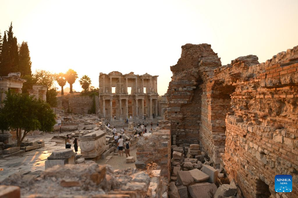 ESMIRNA, 23 julio, 2024 (Xinhua) -- Imagen del 22 de julio de 2024 de turistas visitando la antigua ciudad de Efeso, en Esmirna, Turquía. (Xinhua/Mustafa Kaya)