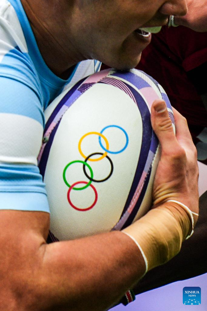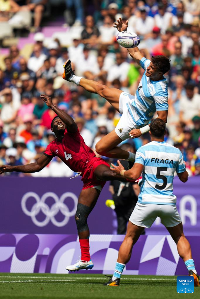 PARIS, 24 julio, 2024 (Xinhua) -- Agustín Fraga de Argentina se abre paso durante el partido masculino del grupo B de rugby 7 entre Kenia y Argentina de los Juegos Olímpicos de París 2024 en el Stade de France, en París, Francia, el 24 de julio de 2024. (Xinhua/Xu Chang)