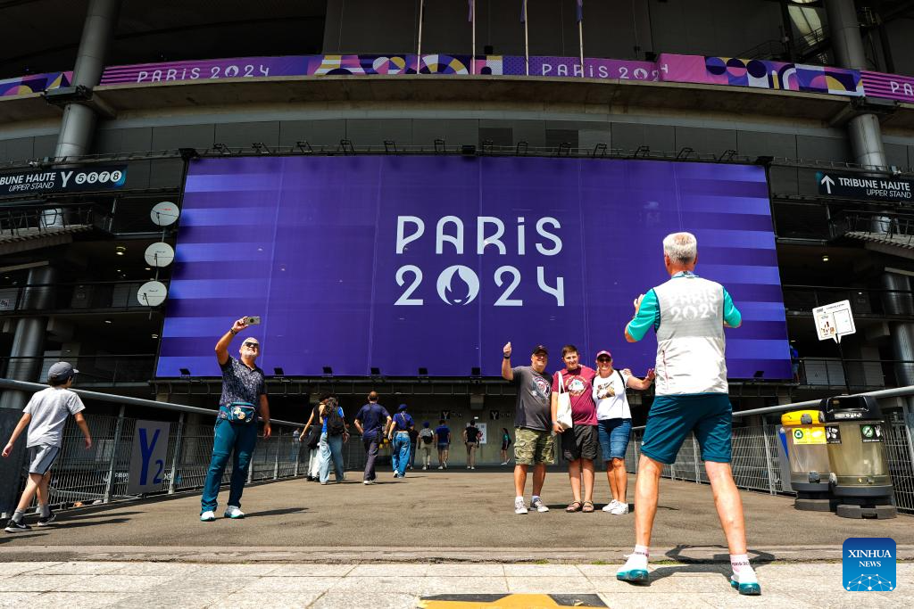 PARIS, 24 julio, 2024 (Xinhua) -- Espectadores toman fotografías frente al Estadio de Francia previo al partido masculino de rugby 7 de los Juegos Olímpicos de París 2024, en París, Francia, el 24 de julio de 2024. (Xinhua/Xu Chang)
