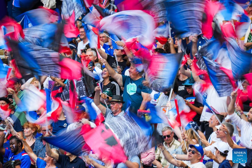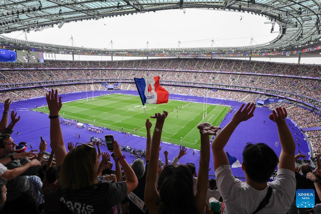PARIS, 24 julio, 2024 (Xinhua) -- Espectadores animan durante el partido masculino del grupo C de rugby 7 entre Francia y Estados Unidos de los Juegos Olímpicos de París 2024, en París, Francia, el 24 de julio de 2024. (Xinhua/Xu Chang)