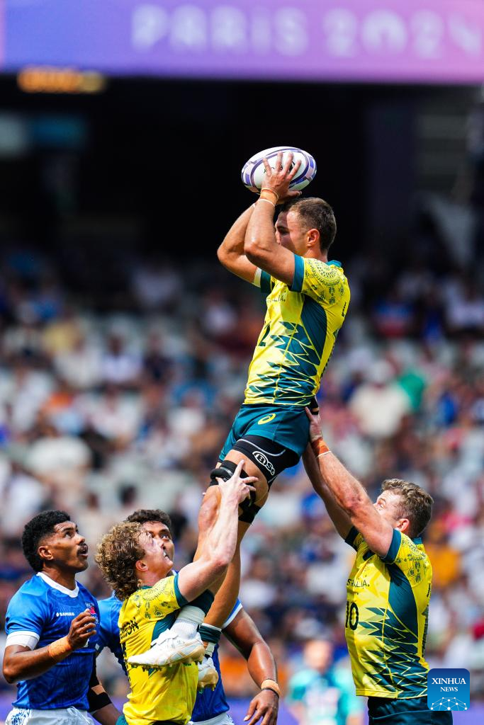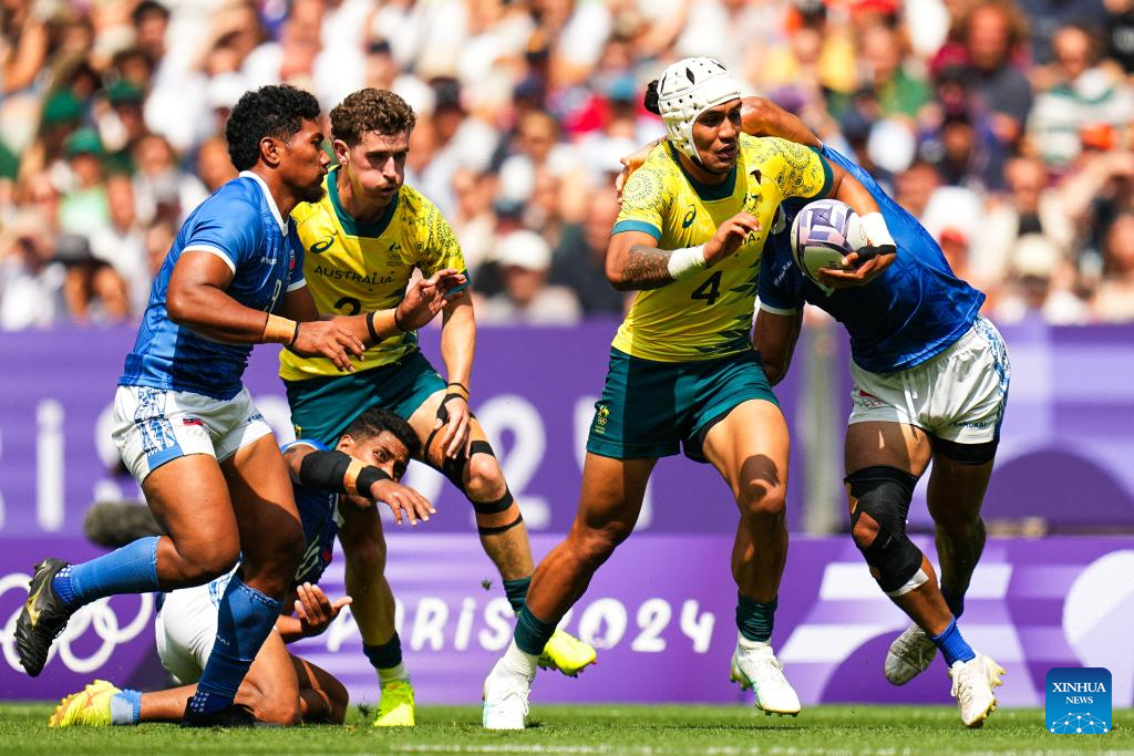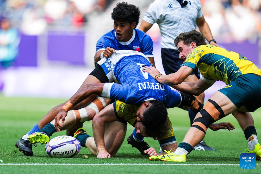 PARIS, 24 julio, 2024 (Xinhua) -- Jugadores compiten durante el partido masculino del grupo B de rugby 7 entre Samoa y Australia de los Juegos Olímpicos de París 2024 en el Stade de France, en París, Francia, el 24 de julio de 2024. (Xinhua/Xu Chang)