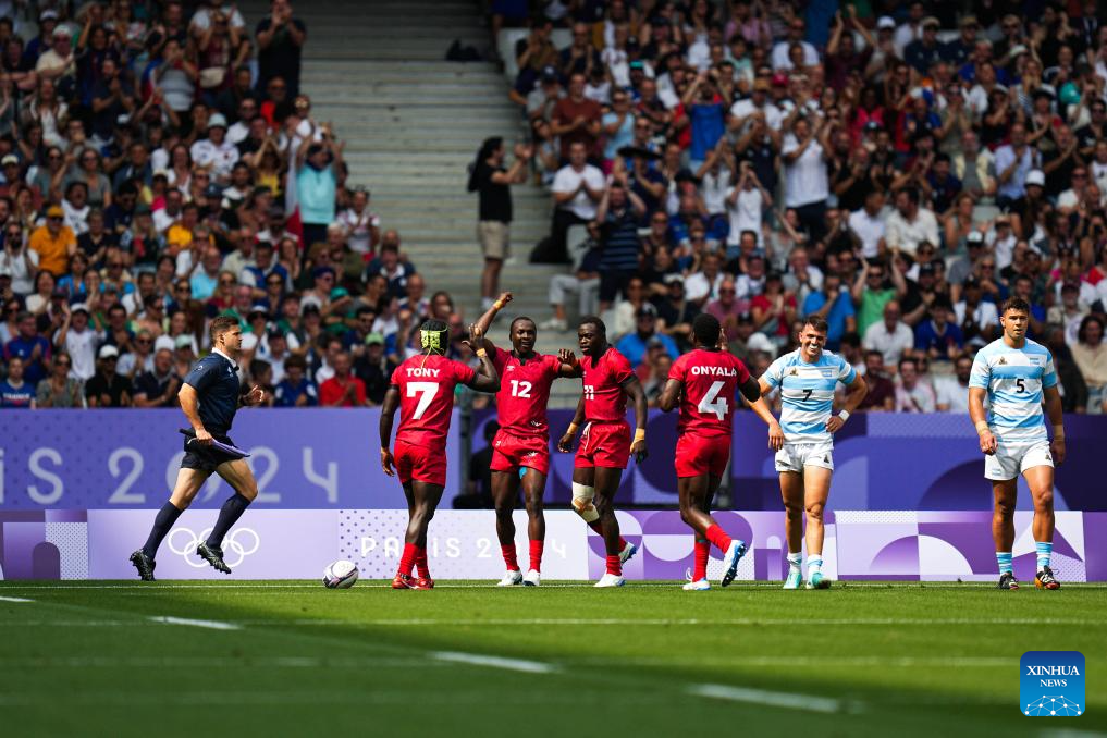PARIS, 24 julio, 2024 (Xinhua) -- Chrisant Ojwang (3-i) de Kenia festeja su anotación durante el partido masculino del grupo B de rugby 7 entre Kenia y Argentina de los Juegos Olímpicos de París 2024 en el Stade de France, en París, Francia, el 24 de julio de 2024. (Xinhua/Xu Chang)