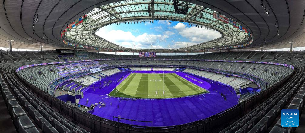PARIS, 24 julio, 2024 (Xinhua) -- Personal revisa el campo y el equipamiento previo al partido masculino de rugby 7 de los Juegos Olímpicos de París 2024 en el Estadio de Francia, en París, Francia, el 24 de julio de 2024. (Xinhua/Xu Chang)