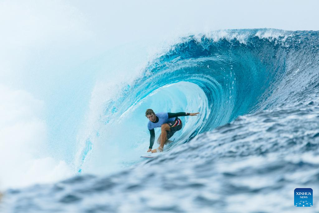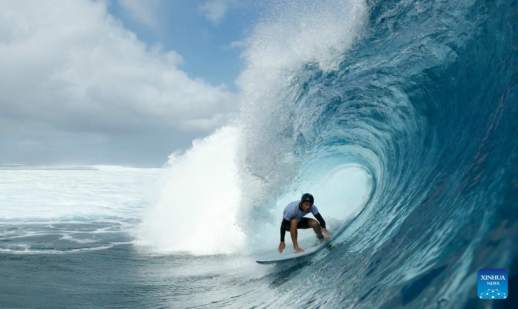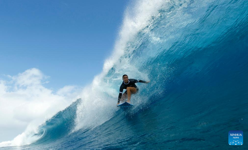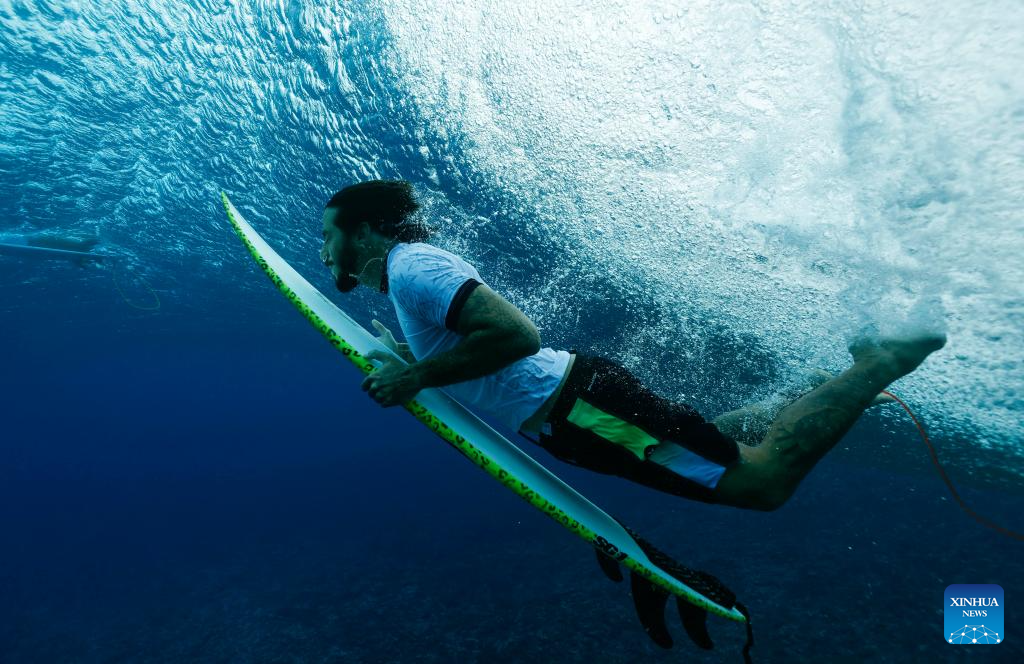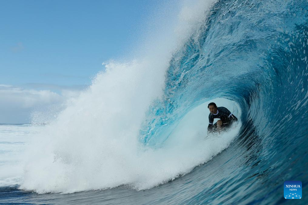 TAHITI, 24 julio, 2024 (Xinhua) -- Imagen del 23 de julio de 2024 de Joao Chianca de Brasil participando en una sesión de entrenamiento de surf previo a los Juegos Olímpicos de París 2024, en Teahupo'o, Tahití, Polinesia Francesa. (Xinhua/Ben Thouard/POOL)