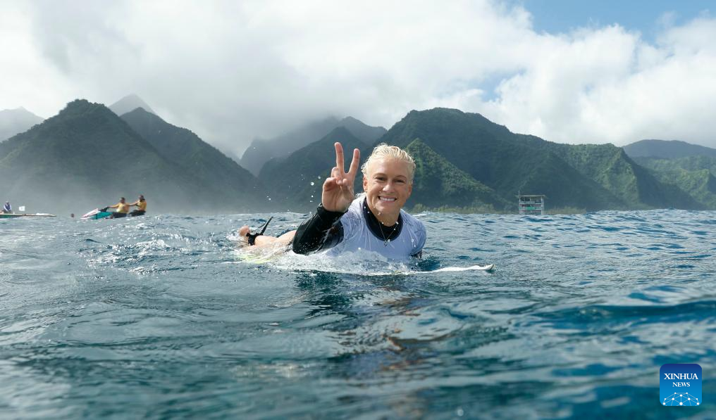 TAHITI, 24 julio, 2024 (Xinhua) -- Imagen del 23 de julio de 2024 de Tatiana Weston-Webb de Brasil reaccionando durante una sesión de entrenamiento de surf previo a los Juegos Olímpicos de París 2024, en Teahupo'o, Tahití, Polinesia Francesa. (Xinhua/Ben Thouard/POOL)
