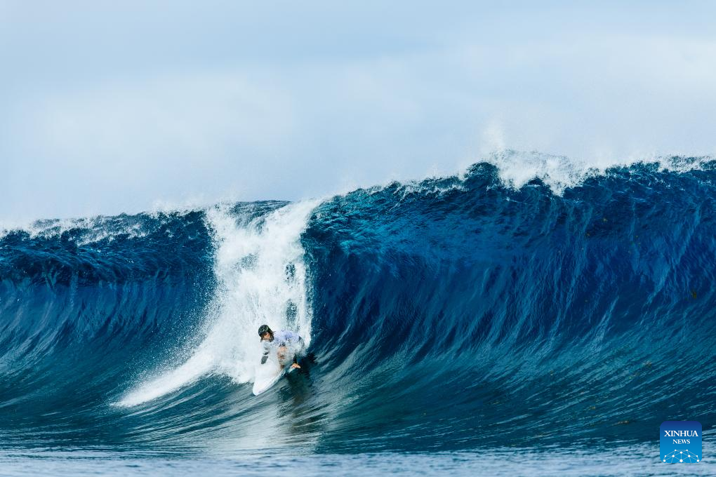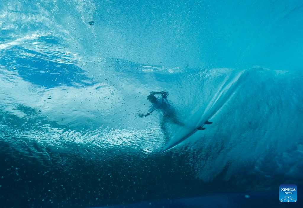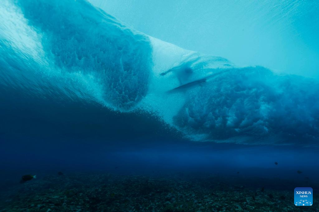 TAHITI, 24 julio, 2024 (Xinhua) -- Imagen del 23 de julio de 2024 de Alonso Correa de Perú participando en una sesión de entrenamiento de surf previo a los Juegos Olímpicos de París 2024, en Teahupo'o, Tahití, Polinesia Francesa. (Xinhua/Ben Thouard/POOL)