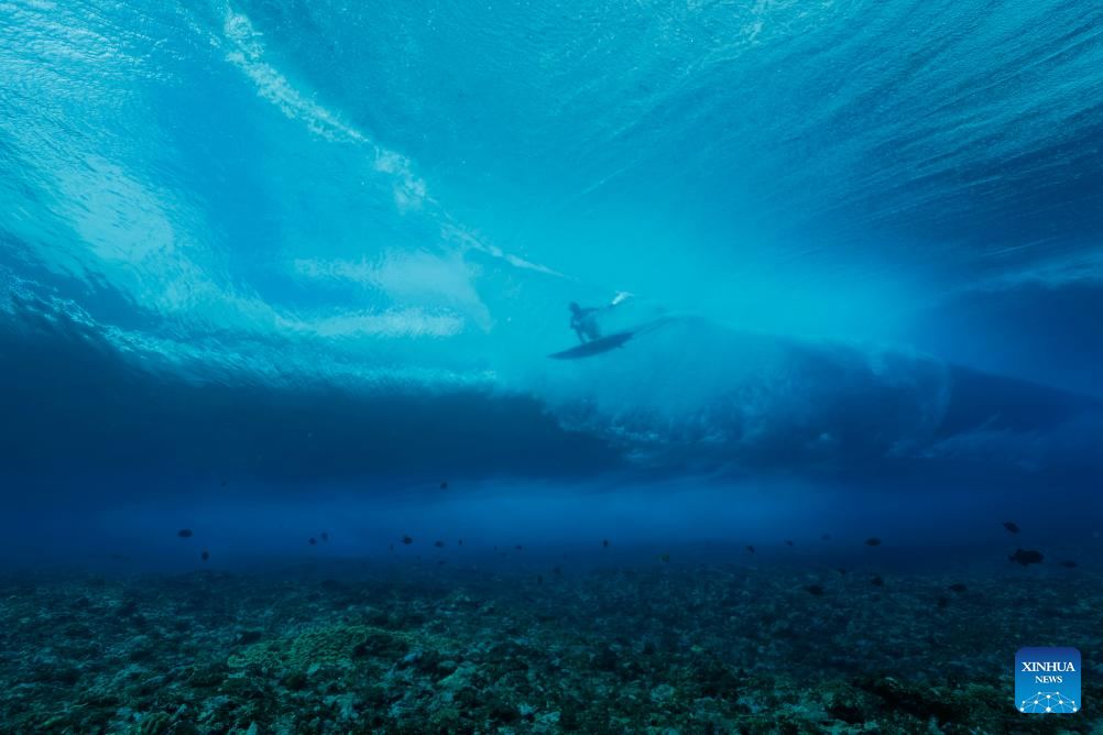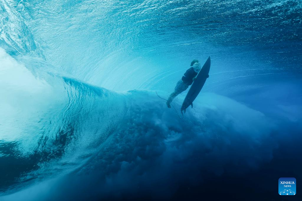 TAHITI, 24 julio, 2024 (Xinhua) -- Imagen del 23 de julio de 2024 de un surfista participando en una sesión de entrenamiento de surf previo a los Juegos Olímpicos de París 2024, en Teahupo'o, Tahití, Polinesia Francesa. (Xinhua/Ben Thouard/POOL)