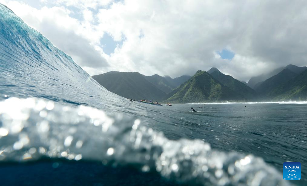 TAHITI, 24 julio, 2024 (Xinhua) -- Imagen del 23 de julio de 2024 de surfistas participando en una sesión de entrenamiento de surf previo a los Juegos Olímpicos de París 2024, en Teahupo'o, Tahití, Polinesia Francesa. (Xinhua/Ben Thouard/POOL)