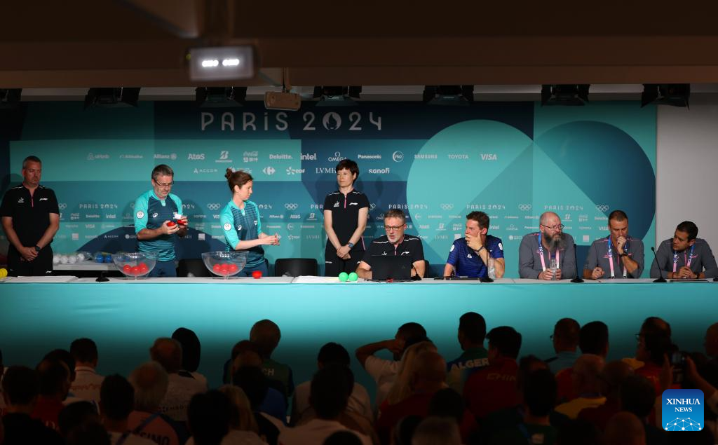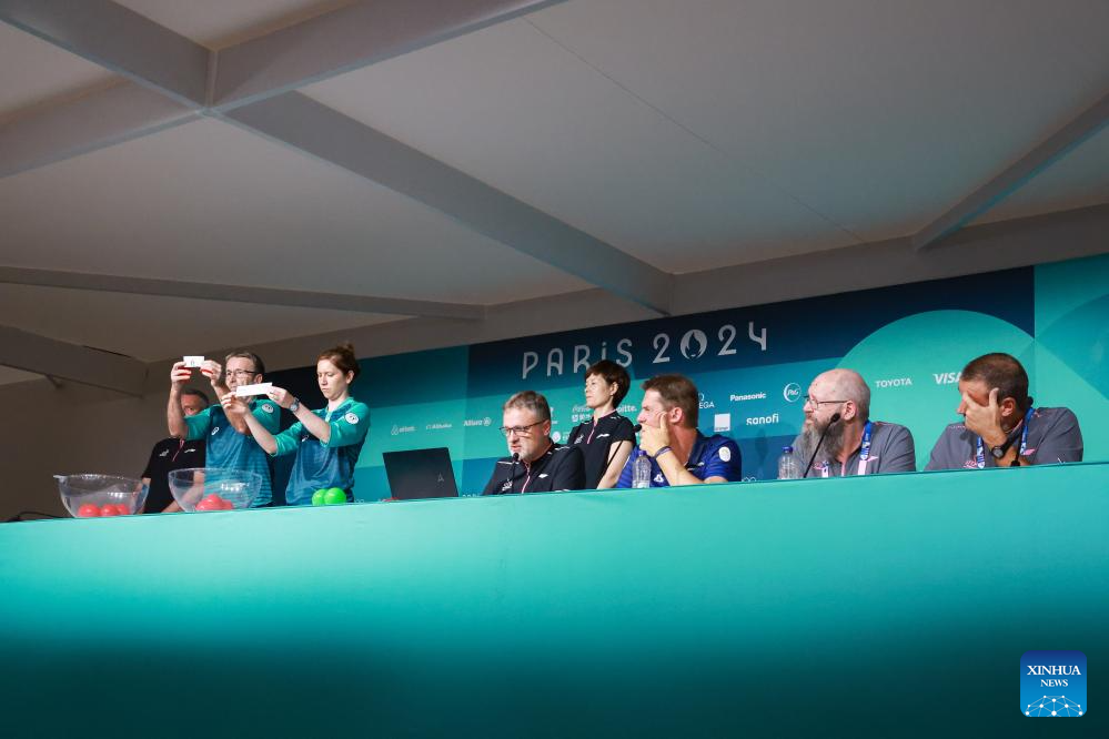 PARIS, 24 julio, 2024 (Xinhua) -- La ceremonia de sorteo del tenis de mesa de los Juegos Olímpicos de París 2024 se lleva a cabo en la París Sur Arena, en París, Francia, el 24 de julio de 2024. (Xinhua/Wang Dongzhen)