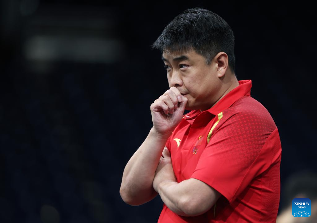 PARIS, 24 julio, 2024 (Xinhua) -- Liu Guoliang, presidente de la Asociación China de Tenis de Mesa, reacciona durante una sesión de entrenamiento de tenis de mesa previo a los Juegos Olímpicos de París 2024, en París, Francia, el 24 de julio de 2024. (Xinhua/Liu Xu)