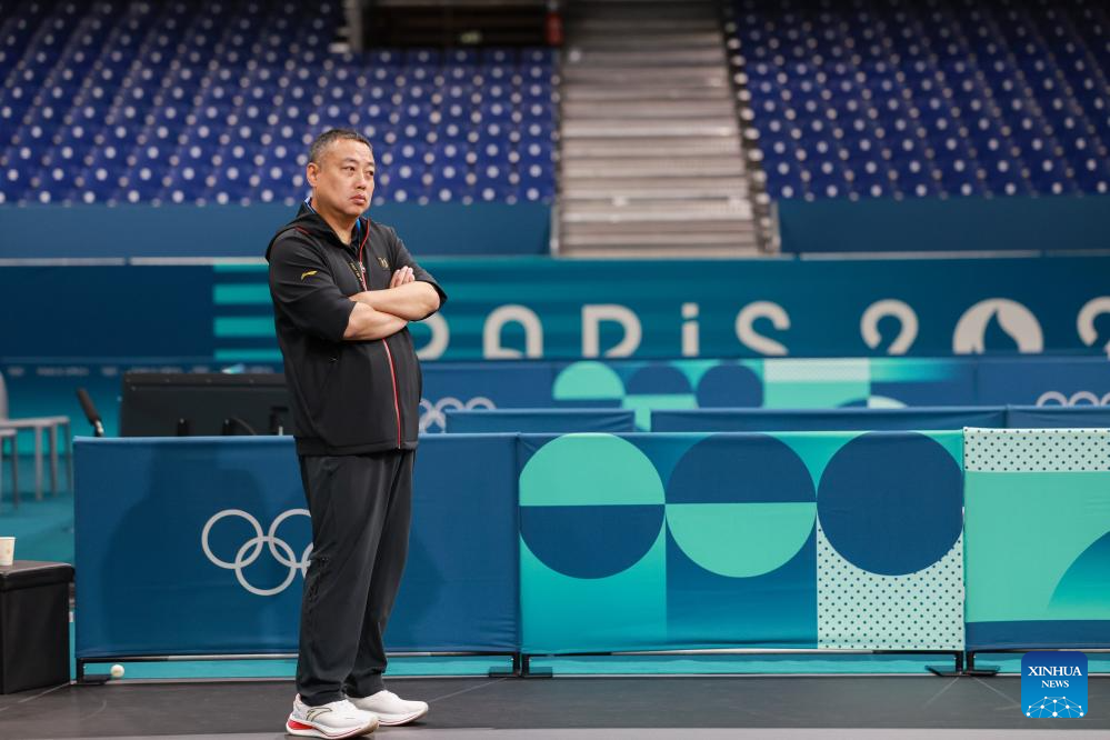 PARIS, 24 julio, 2024 (Xinhua) -- Wang Hao, entrenador del equipo nacional chino de tenis de mesa, reacciona durante una sesión de entrenamiento de tenis de mesa previo a los Juegos Olímpicos de París 2024, en París, Francia, el 24 de julio de 2024. (Xinhua/Wang Dongzhen)