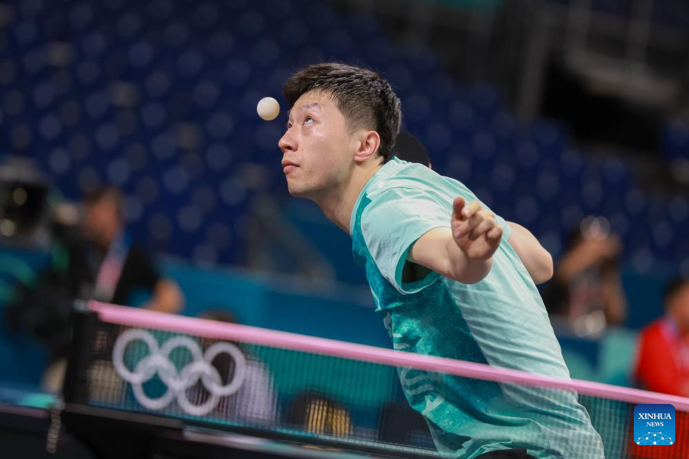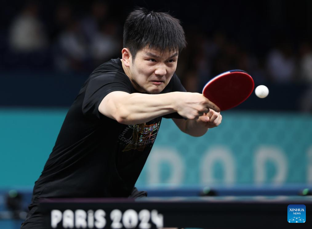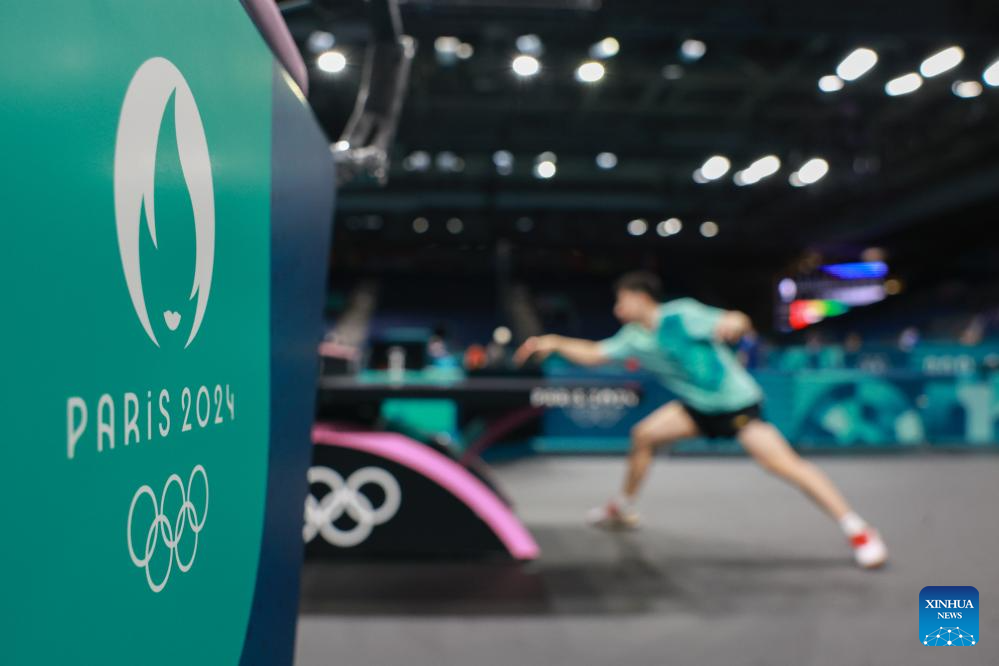 PARIS, 24 julio, 2024 (Xinhua) -- Ma Long de China participa en una sesión de entrenamiento de tenis de mesa previo a los Juegos Olímpicos de Paris 2024, en París, Francia, el 24 de julio de 2024. (Xinhua/Liu Xu)
