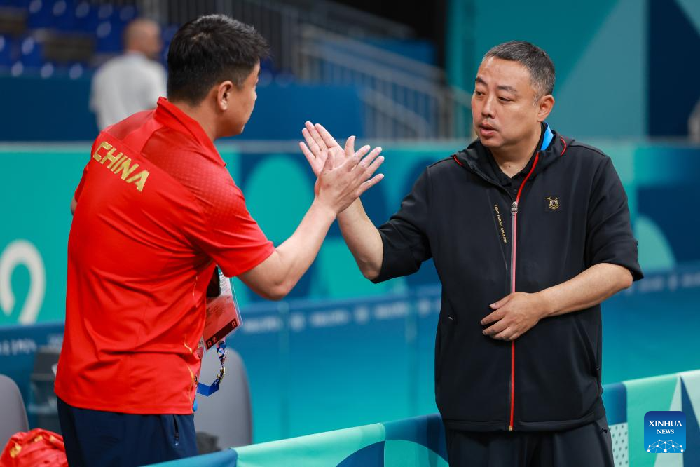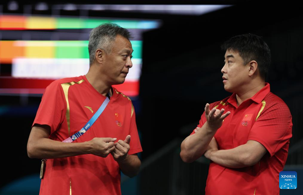 PARIS, 24 julio, 2024 (Xinhua) -- Liu Guoliang (d), presidente de la Asociación China de Tenis de Mesa, interactúa con Wang Hao, entrenador del equipo nacional chino de tenis de mesa durante una sesión de entrenamiento de tenis de mesa previo a los Juegos Olímpicos de París 2024, en París, Francia, el 24 de julio de 2024. (Xinhua/Liu Xu)