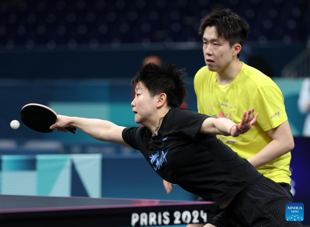 PARIS, 24 julio, 2024 (Xinhua) -- Wang Chuqin (atrás)/Sun Yingsha de China participan en una sesión de entrenamiento de tenis de mesa previo a los Juegos Olímpicos de París 2024, en París, Francia, el 24 de julio de 2024. (Xinhua/Wang Dongzhen)
