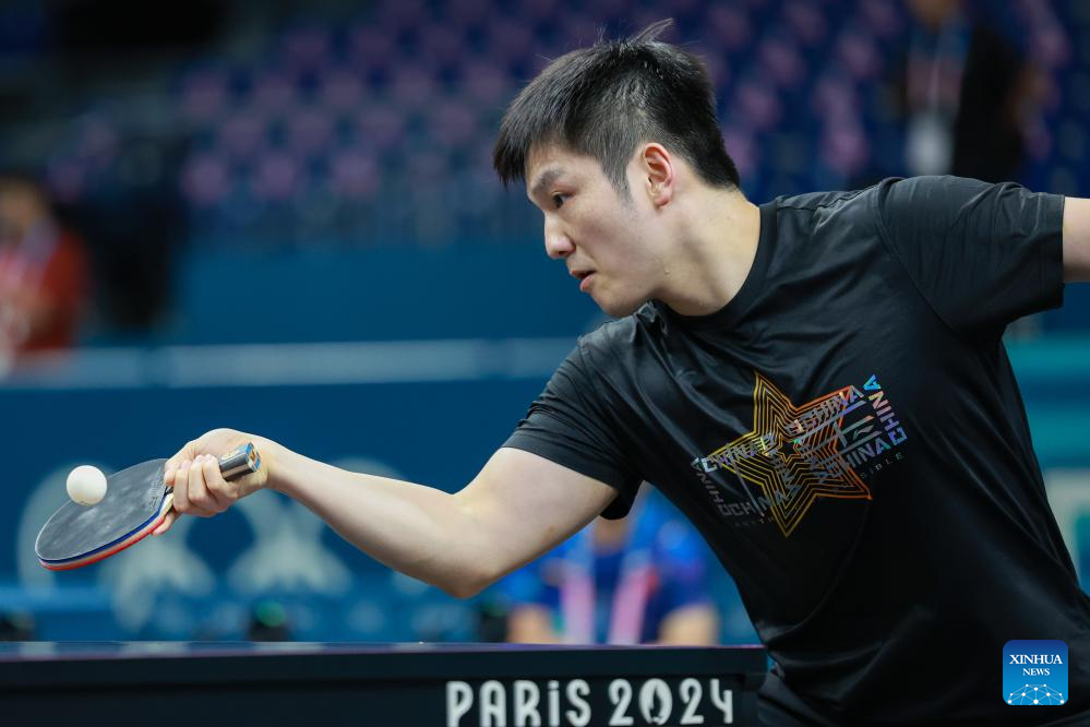 PARIS, 24 julio, 2024 (Xinhua) -- Fan Zhendong de China participa en una sesión de entrenamiento de tenis de mesa previo a los Juegos Olímpicos de París 2024, en París, Francia, el 24 de julio de 2024. (Xinhua/Wang Dongzhen)