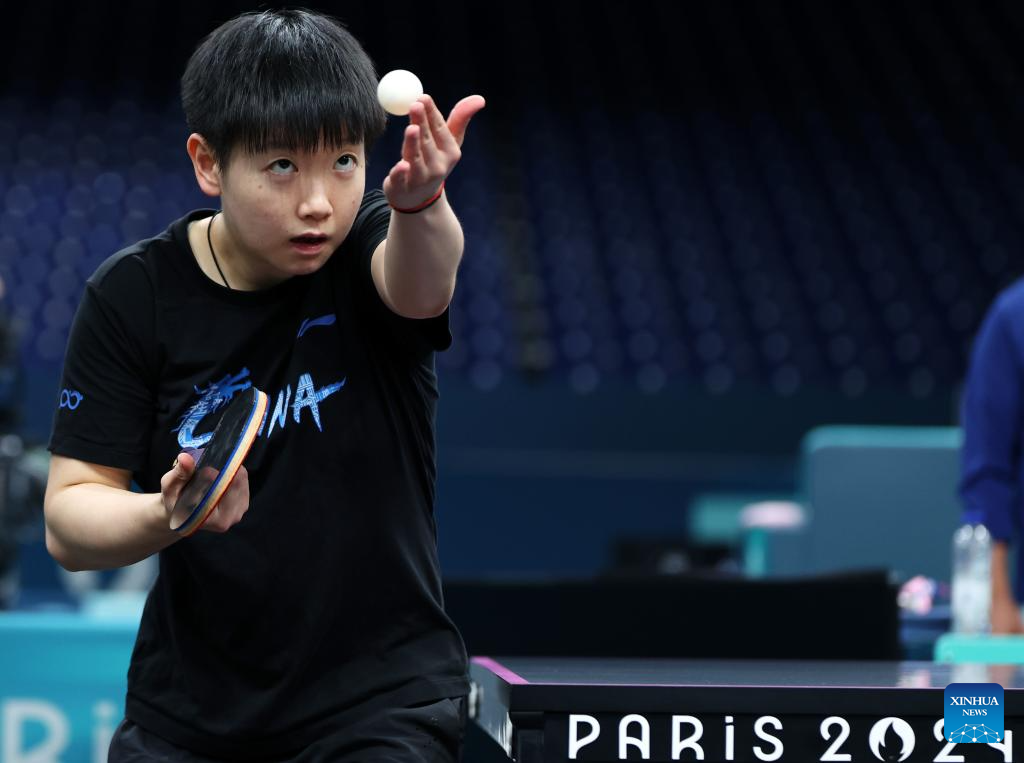 PARIS, 24 julio, 2024 (Xinhua) -- Sun Yingsha de China participa en una sesión de entrenamiento de tenis de mesa previo a los Juegos Olímpicos de París 2024, en París, Francia, el 24 de julio de 2024. (Xinhua/Wang Dongzhen)