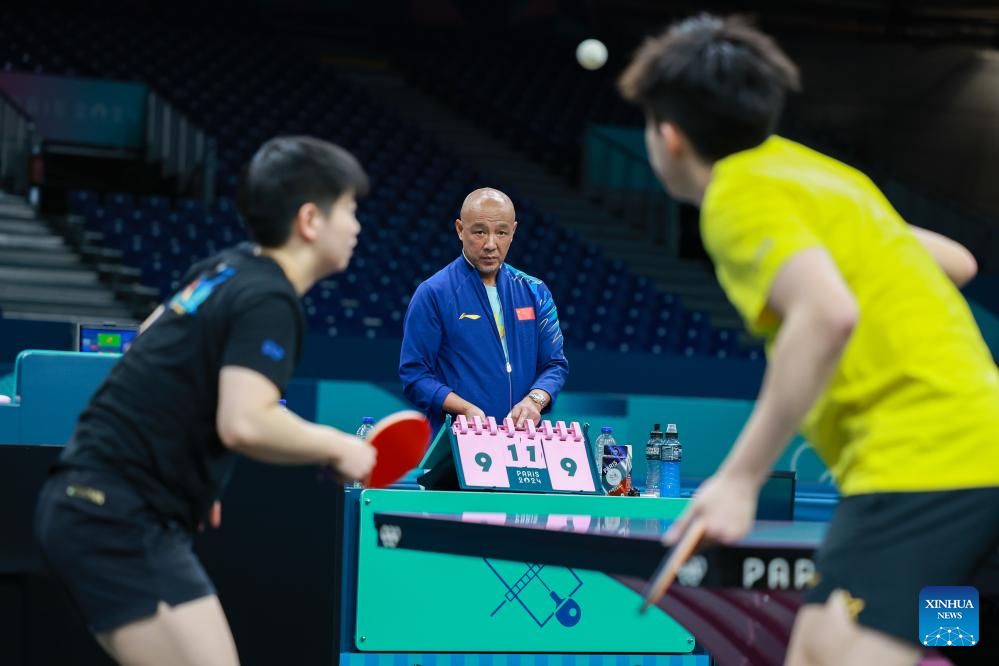 PARIS, 24 julio, 2024 (Xinhua) -- Xiao Zhan (c), entrenador del equipo nacional chino de tenis de mesa observa a Wang Chuqin/Sun Yingsha de China durante una sesión de entrenamiento de tenis de mesa previo a los Juegos Olímpicos de París 2024, en París, Francia, el 24 de julio de 2024. (Xinhua/Liu Xu)