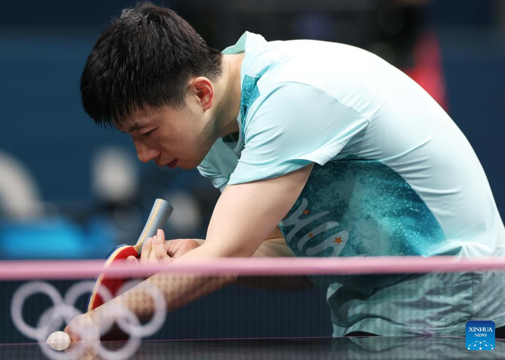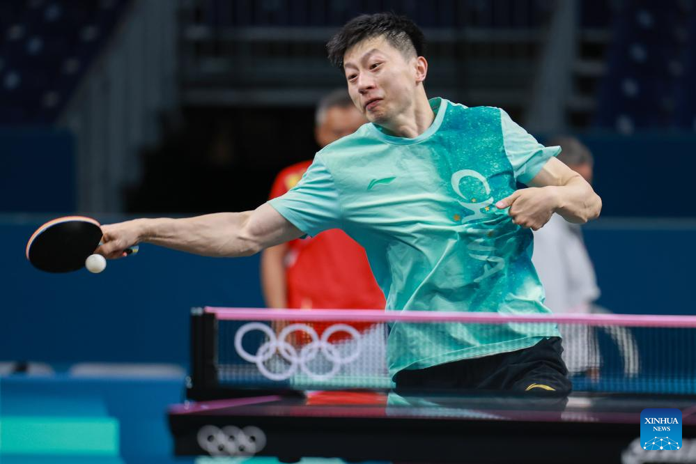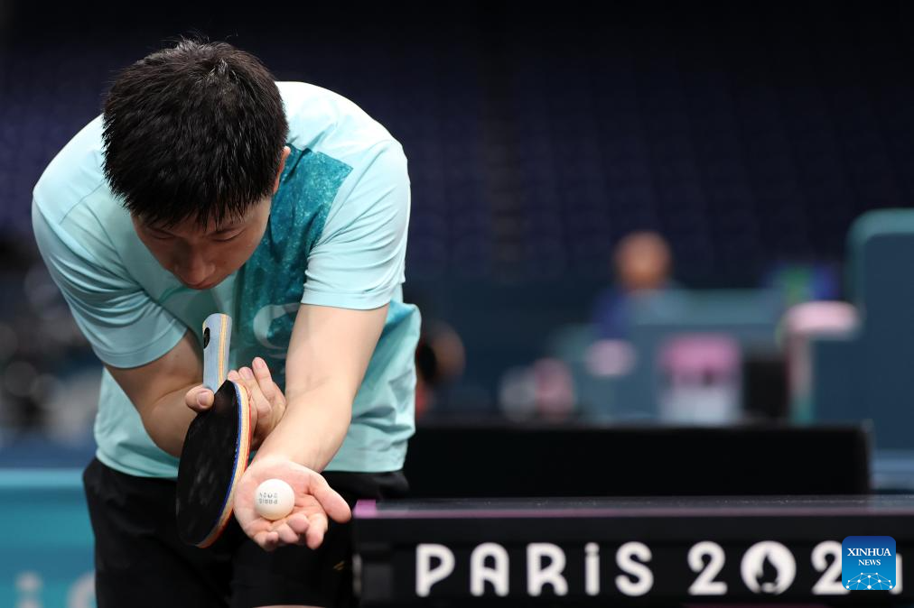 PARIS, 24 julio, 2024 (Xinhua) -- Ma Long de China participa en una sesión de entrenamiento de tenis de mesa previo a los Juegos Olímpicos de París 2024, en París, Francia, el 24 de julio de 2024. (Xinhua/Wang Dongzhen)