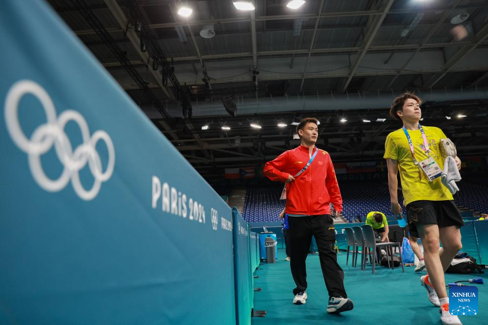PARIS, 24 julio, 2024 (Xinhua) -- Wang Chuqin (d) de China sale después de una sesión de entrenamiento de tenis de mesa previo a los Juegos Olímpicos de París 2024, en París, Francia, el 24 de julio de 2024. (Xinhua/Liu Xu)