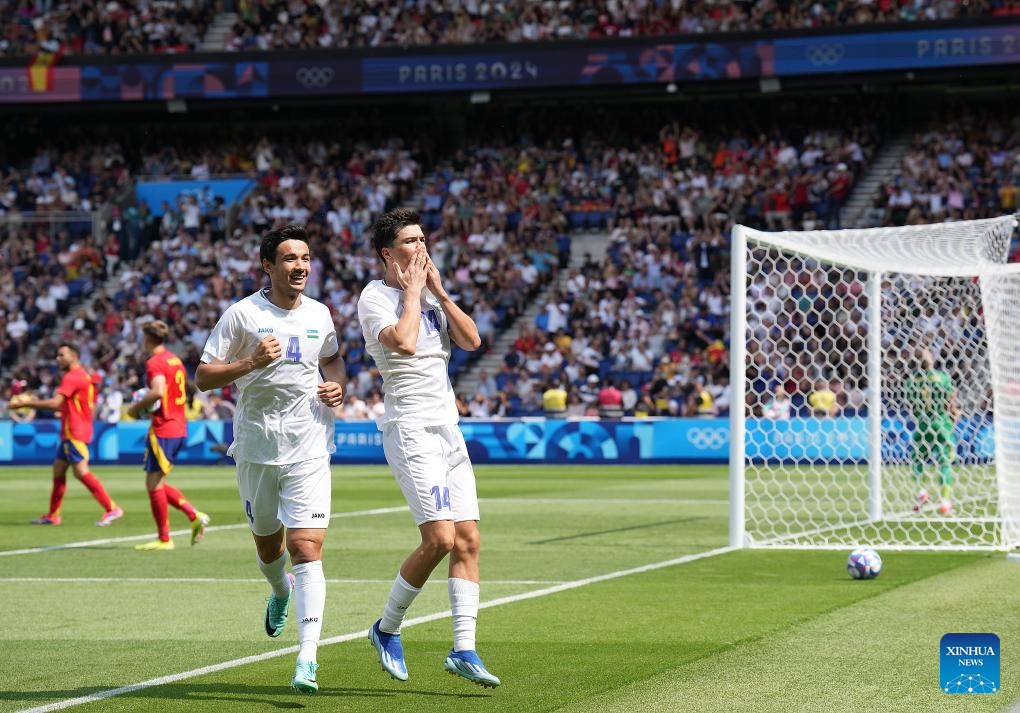 PARIS, 24 julio, 2024 (Xinhua) -- Eldor Shomurodov (d), de Uzbekistán, festeja luego de anotar el primer punto de su equipo durante el partido de fútbol del grupo C masculino entre Uzbekistán y España de los Juegos Olímpicos de París 2024, en París, Francia, el 24 de julio de 2024. (Xinhua/Huang Zongzhi)