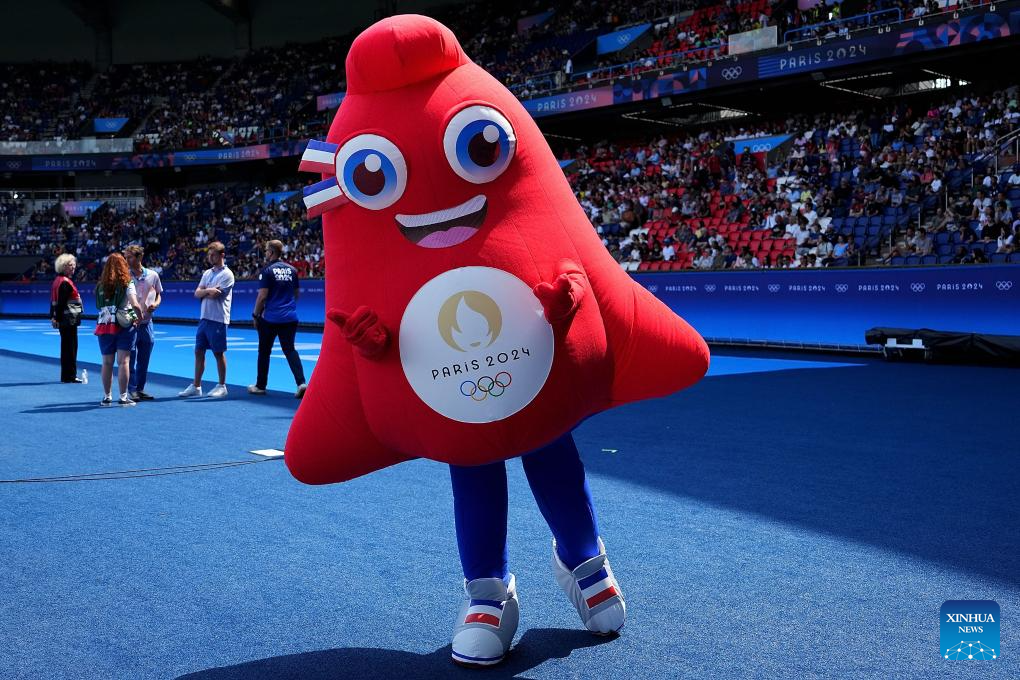 PARIS, 24 julio, 2024 (Xinhua) -- La mascota olímpica Phyrge posa durante el partido de fútbol del grupo C masculino entre Uzbekistán y España de los Juegos Olímpicos de París 2024, en París, Francia, el 24 de julio de 2024. (Xinhua/Li Yibo)