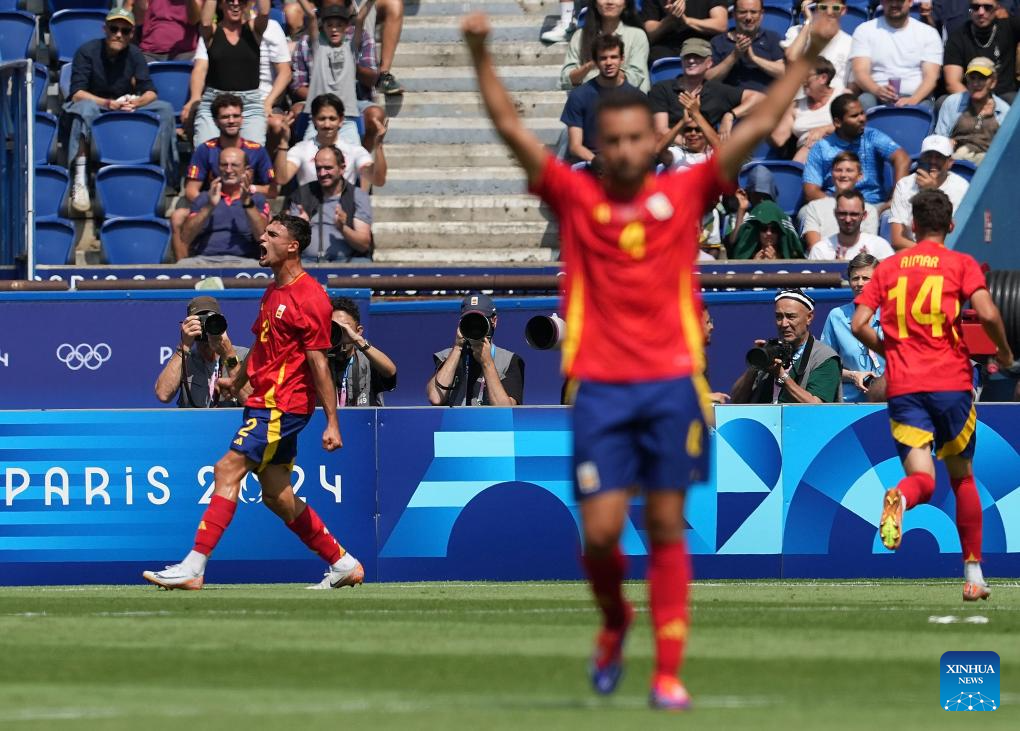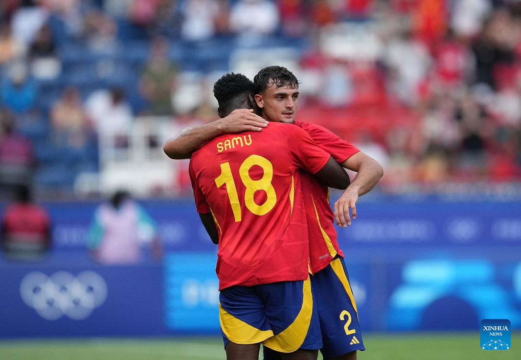 PARIS, 24 julio, 2024 (Xinhua) -- Marc Pubill (i), de España, festeja su anotación durante el partido de fútbol del grupo C masculino entre Uzbekistán y España de los Juegos Olímpicos de París 2024, en París, Francia, el 24 de julio de 2024. (Xinhua/Li Yibo)