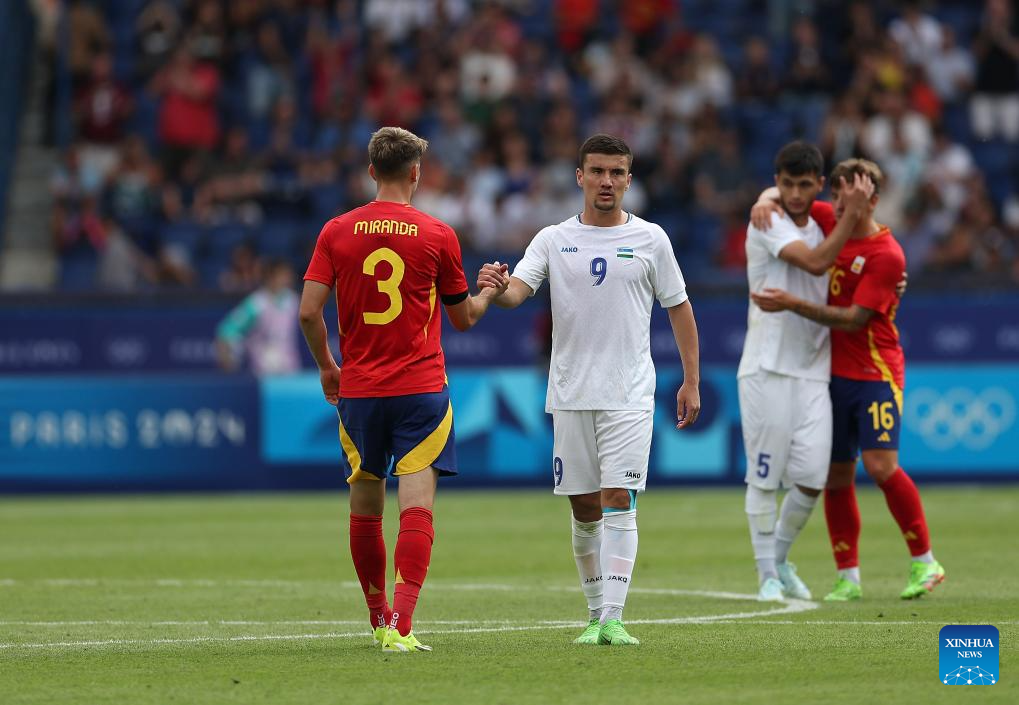 PARIS, 24 julio, 2024 (Xinhua) -- Juan Miranda (i), de España, y Khusain Norchaev (2-i), de Uzbekistán, reaccionan luego del partido de fútbol del grupo C masculino, entre Uzbekistán y España, de los Juegos Olímpicos de París 2024, en París, Francia, el 24 de julio de 2024. (Xinhua/Huang Zongzhi)