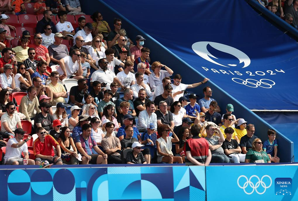 PARIS, 24 julio, 2024 (Xinhua) -- La audiencia observa el partido de fútbol del grupo C masculino entre Uzbekistán y España de los Juegos Olímpicos de París 2024, en París, Francia, el 24 de julio de 2024. (Xinhua/Huang Zongzhi)