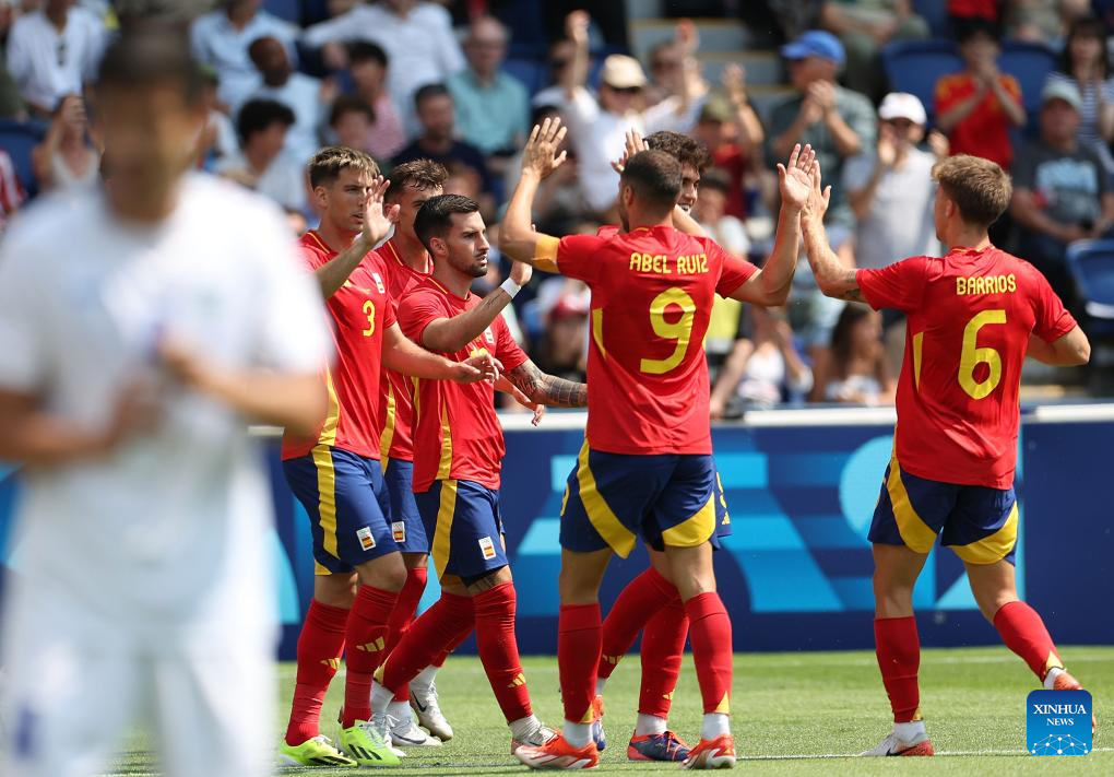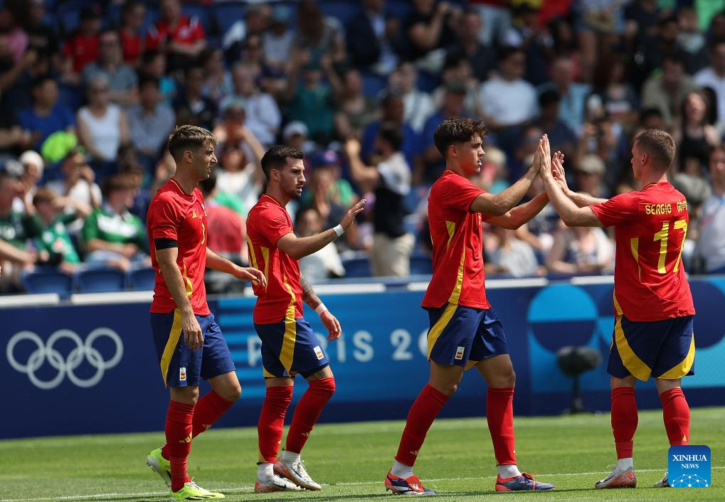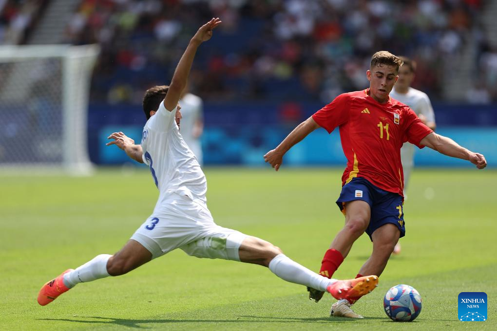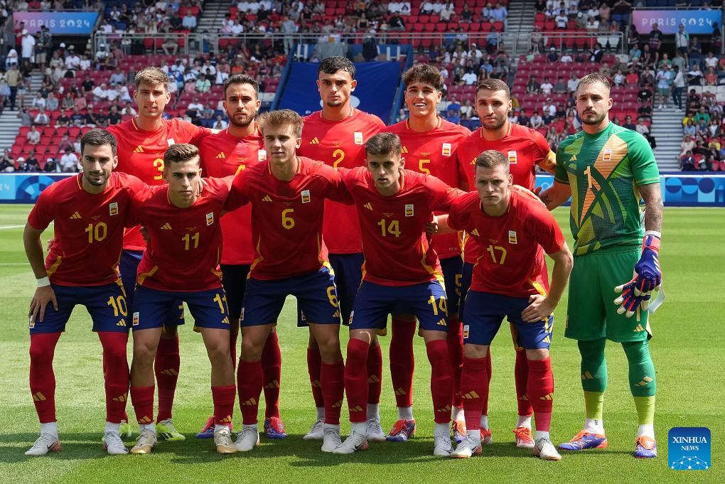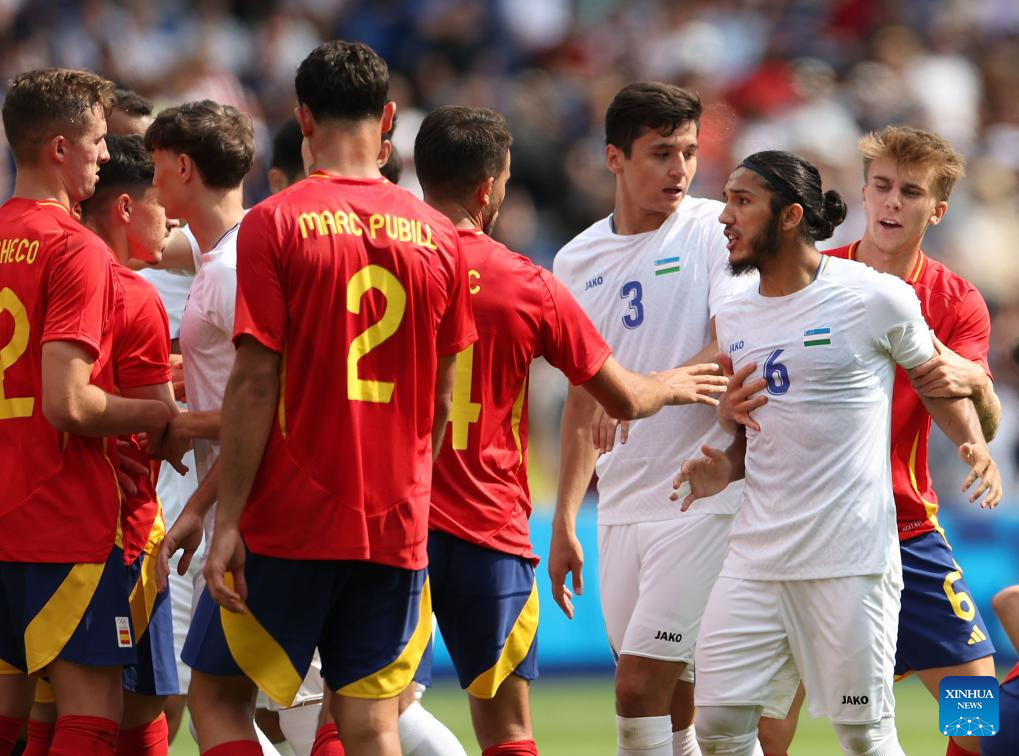 PARIS, 24 julio, 2024 (Xinhua) -- Jugadores de España reaccionan durante el partido de fútbol del grupo C masculino entre Uzbekistán y España de los Juegos Olímpicos de París 2024, en París, Francia, el 24 de julio de 2024. (Xinhua/Huang Zongzhi)