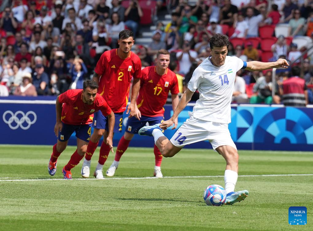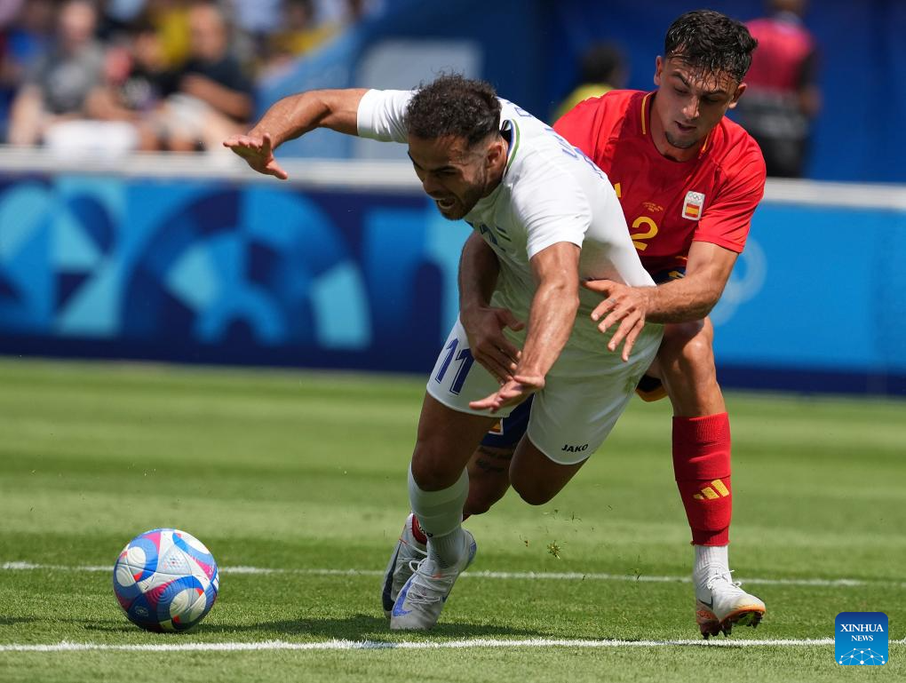 PARIS, 24 julio, 2024 (Xinhua) -- Eldor Shomurodov (d), de Uzbekistán, compite durante el partido de fútbol del grupo C masculino, entre Uzbekistán y España de los Juegos Olímpicos de París 2024, en París, Francia, el 24 de julio de 2024. (Xinhua/Li Yibo)