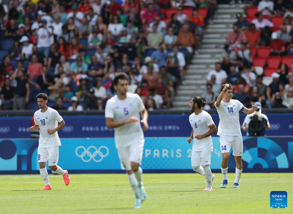 PARIS, 24 julio, 2024 (Xinhua) -- Ibrokhimkhalil Yuldoshev (2-d), de Uzbekistán, reacciona durante el partido de fútbol del grupo C masculino entre Uzbekistán y España de los Juegos Olímpicos de París 2024, en París, Francia, el 24 de julio de 2024. (Xinhua/Huang Zongzhi)