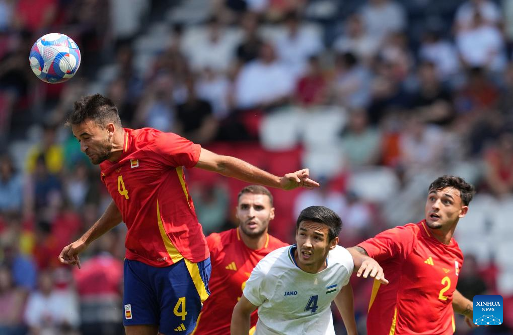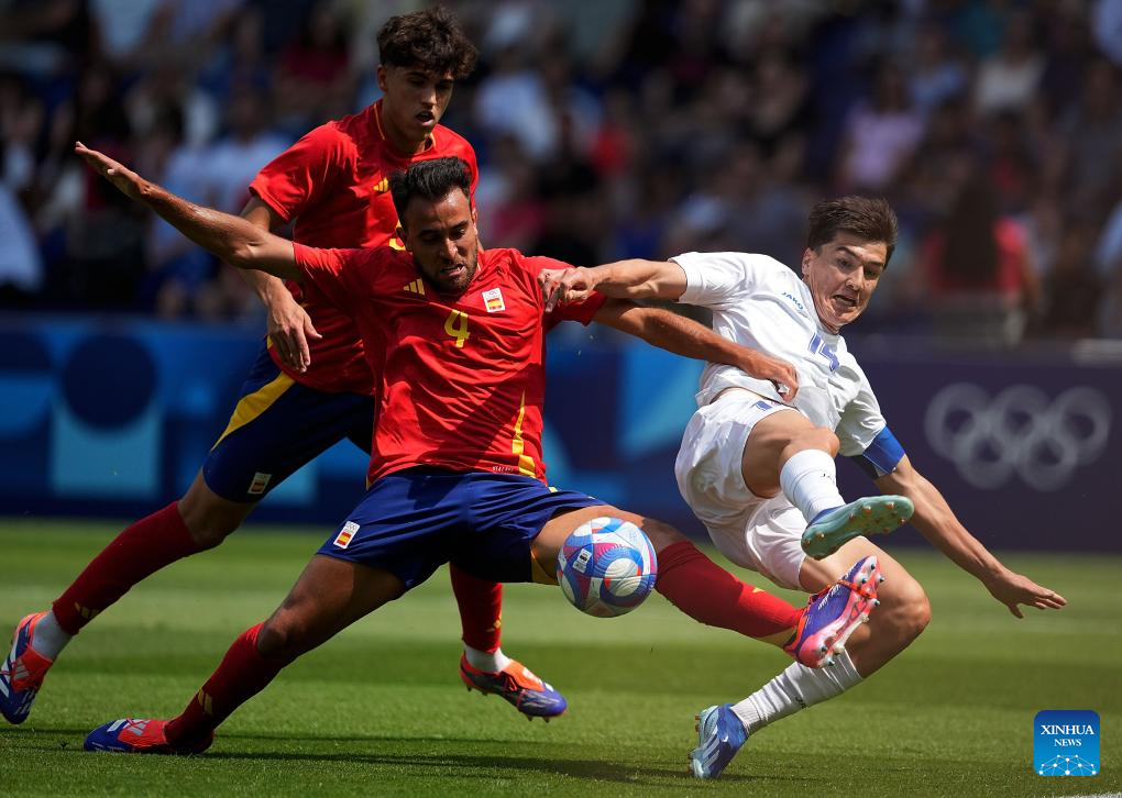 PARIS, 24 julio, 2024 (Xinhua) -- Eric García (i), de España, compite durante el partido de fútbol del grupo C masculino entre Uzbekistán y España de los Juegos Olímpicos de París 2024, en París, Francia, el 24 de julio de 2024. (Xinhua/Li Yibo)