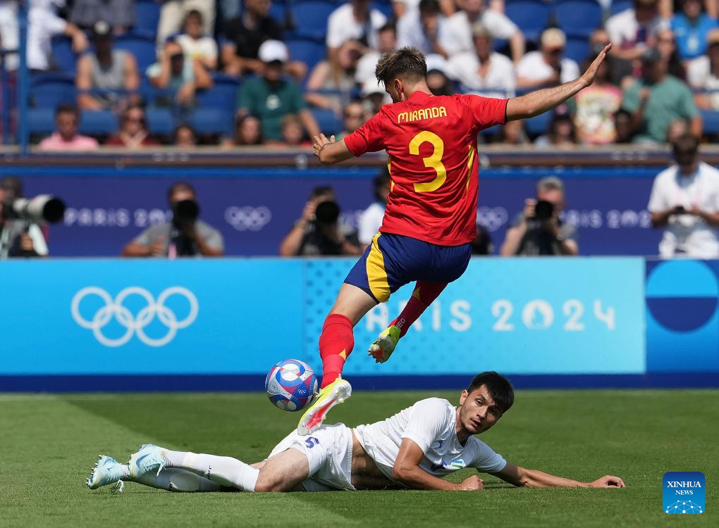 PARIS, 24 julio, 2024 (Xinhua) -- Juan Miranda (arriba), de España, compite durante el partido de fútbol del grupo C masculino entre Uzbekistán y España de los Juegos Olímpicos de París 2024, en París, Francia, el 24 de julio de 2024. (Xinhua/Li Yibo)