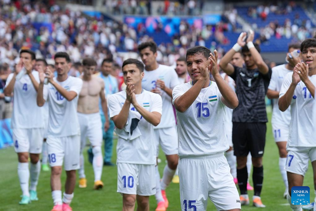 PARIS, 24 julio, 2024 (Xinhua) -- Jugadores de Uzbekistán saludan a la audiencia luego del partido de fútbol del grupo C masculino entre Uzbekistán y España de los Juegos Olímpicos de París 2024, en París, Francia, el 24 de julio de 2024. (Xinhua/Li Yibo)