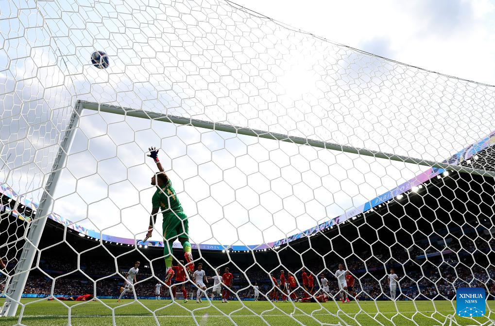 PARIS, 24 julio, 2024 (Xinhua) -- El guardameta Arnau Tenas, de España, ataja el balón el partido de fútbol del grupo C masculino entre Uzbekistán y España de los Juegos Olímpicos de París 2024, en París, Francia, el 24 de julio de 2024. (Xinhua/Li Yibo)