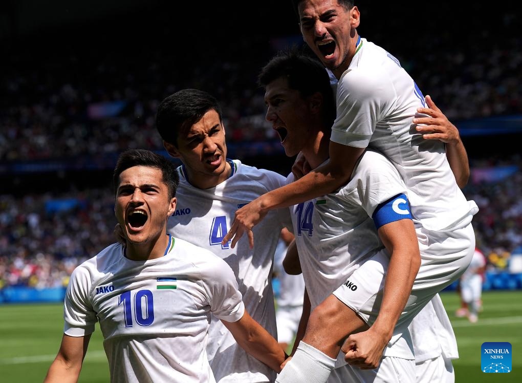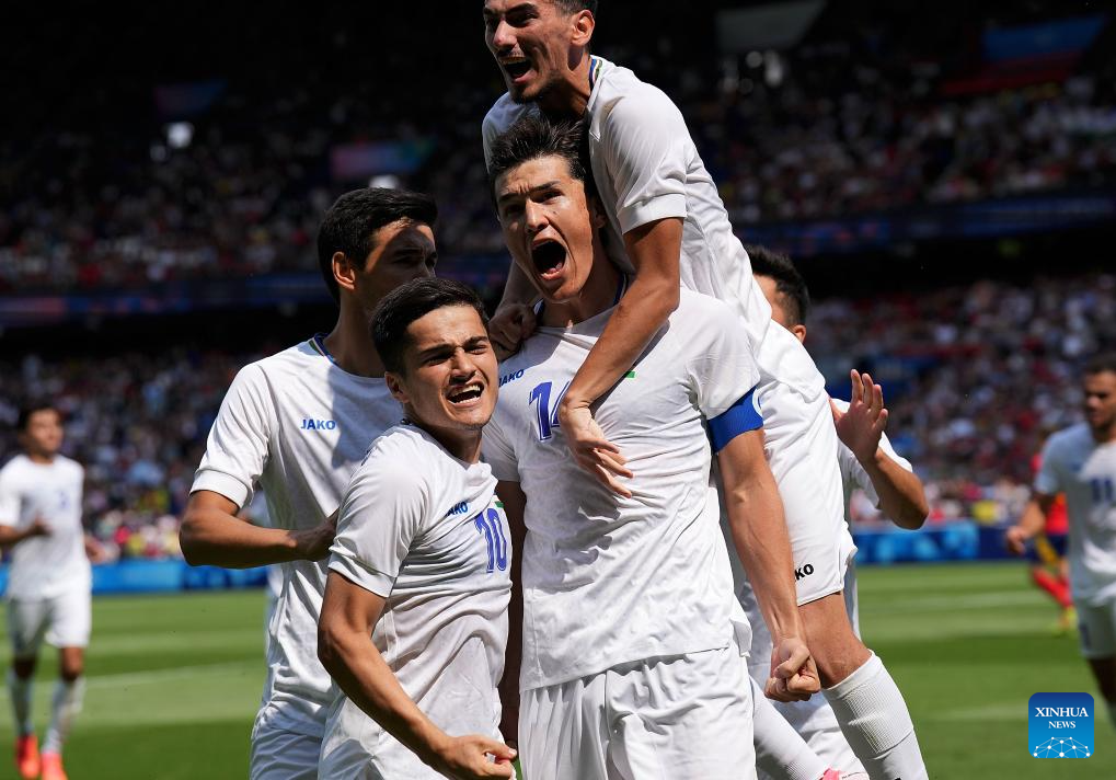 PARIS, 24 julio, 2024 (Xinhua) -- Eldor Shomurodov (2-d), de Uzbekistán, festeja con sus compañeros de equipo luego de anotar el primer punto de su equipo durante el partido de fútbol del grupo C masculino entre Uzbekistán y España de los Juegos Olímpicos de París 2024, en París, Francia, el 24 de julio de 2024. (Xinhua/Li Yibo)