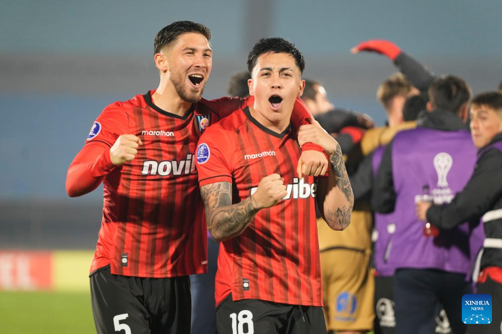 MONTEVIDEO, 24 julio, 2024 (Xinhua) -- Imagen del 23 de julio de 2024 de los jugadores Felipe Loyola(i) y Joaquín Gutiérrez (d), de Huachipato de Chile, festejando luego de un partido correspondiente a los playoff de la Copa CONMEBOL Sudamericana, ante Racing de Uruguay, celebrado en el estadio Centenario, en Montevideo, capital de Uruguay. (Xinhua/Nicolás Celaya)