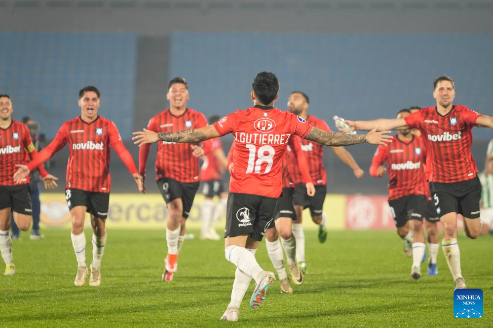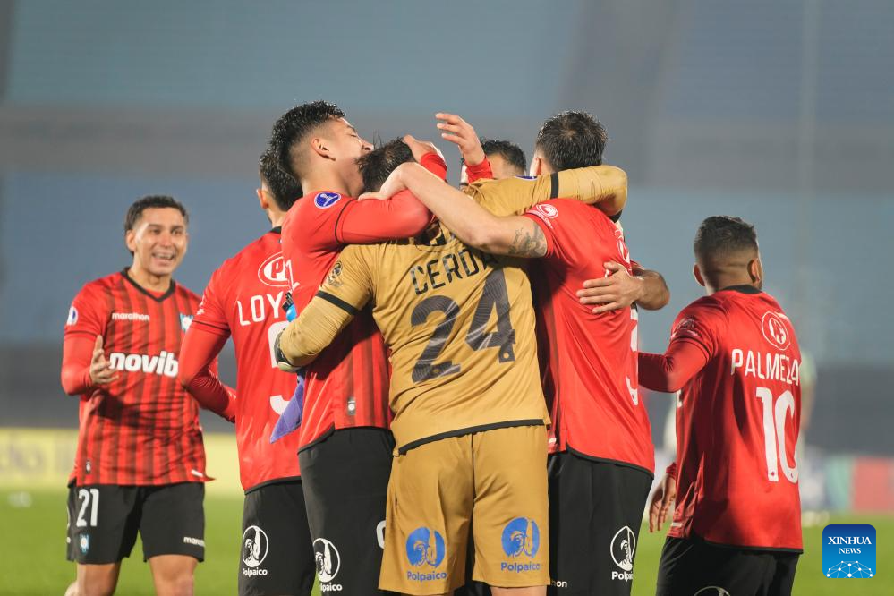 MONTEVIDEO, 24 julio, 2024 (Xinhua) -- Imagen del 23 de julio de 2024 de jugadores de Huachipato de Chile festejando luego de un partido correspondiente a los playoff de la Copa CONMEBOL Sudamericana, ante Racing de Uruguay, celebrado en el estadio Centenario, en Montevideo, capital de Uruguay. (Xinhua/Nicolás Celaya)